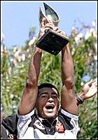 Romário desemnbarcou à frente do grupo, carregando a taça e usando um gorro vermelho de Papai Noel.