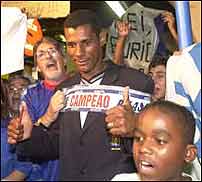 Uma pequena multidão de torcedores recebeu os jogadores do São Caetano, que voltaram para São Paulo na noite deste sábado. Com faixas e cartazes contra o Vasco, eles já festejavam o título.