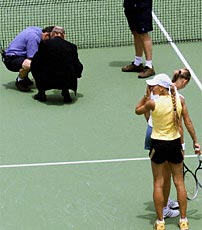 No primeiro set, um torcedor lançou um foguete sinalizador aos pés da musa Kournikova. O foguete começou a soltar uma fumaça alaranjada.