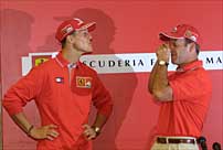 São Paulo - O final da entrevista do brasileiro Rubens Barrichello e a entrada de Michael Schumacher na sala de imprensa para conversar com os repórteres proporcionou o momento mais descontraído da manhã entre os pilotos.