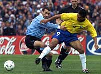 O Brasil teve bastante dificuldade no primeiro tempo. Juninho e Rivaldo não conseguiam articular jogadas de ataque. O Uruguai era mais perigoso, principalmente com as descidas de Recoba e Magallanes.