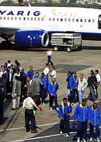 Os jogadores da Seleção Brasileira desembarcaram pouco depois das 12h em Porto Alegre, onde enfrentam nesta quarta-feira a seleção do Paraguai. Incentivados pelo cartola Emídio Perondi, o técnico Luiz Felipe Scolari e alguns jogadores foram saudar os torcedores. Com muita dificuldade - e bastante relutância principalmente por parte de Felipão -, Roberto Carlos, Rivaldo e Tinga enfrentaram o assédio dos repórteres e deram autógrafos para a torcida. A Seleção vai agora para o hotel De Ville, ao lado do aeroporto. Cerca de 500 pessoas estavam no aeroporto.