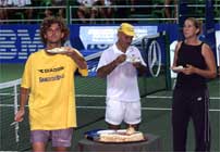 Ao final do parabéns, Guga cortou o bolo de morango providenciado pelos organizadores do torneio e ofereceu o pedaço à tenista Mônica Seles. A americana, visivelmente acima do peso, foi chamada para a festa e se mostrou bastante simpática.