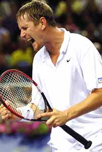 Rio - O russo Yevgeny Kafelnikov é o primeiro tenista do Grupo Ken Rosewall a garantir vaga nas semifinais da Masters Cup 2001, em Sydney. Nesta quinta-feira, ele derrotou o croata Goran Ivanisevic com facilidade por 2 sets a 0, com parciais de 6/3 e 6/4, na partida que fechou a segunda rodada. No primeiro jogo do dia, o espanhol Juan Carlos Ferrero derrotou o brasileiro Gustavo Kuerten por 2 a 0.
