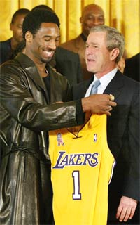 Washington - Em visita à Casa Branca, o ala-armador do Lakers, Kobe Bryant, deu sua camisa ao presidente George W.Bush, que ficou na ponta dos pés para tentar encarar olho no olho o jogador, de 2,01m.