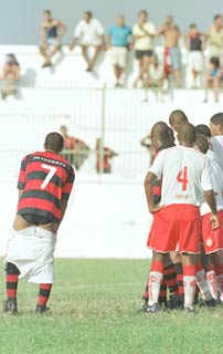 Rio - Quatro torcedores do Flamengo invadiram o gramado do Estádio Moça Bonita minutos antes do fim da partida em que o Rubro-Negro empatou com o América por 1 a 1, pelo Caixão 2002. Os torcedores tentaram agredir os jogadores do clube quando o Flamengo ainda estava em desvantagem no placar. O atacante Roma foi atingido.