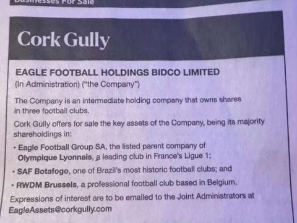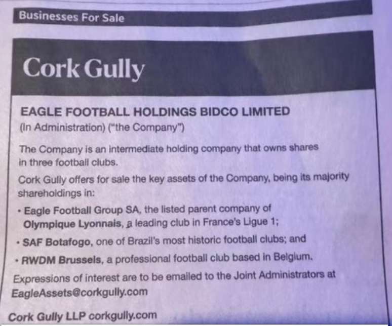 A SAF do Botafogo foi colocada à venda pela consultoria britânica Cork Gully, que no fim de março foi nomeada administradora judicial pelos credores da Eagle Football. Ela publicou um anúncio no jornal britânico Financial Times, onde diz ter participação em três clubes de futebol.