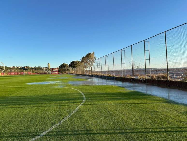 A elevação gradual do nível do Guaíba, somada aos ventos intensos que atingem a região, começou a causar alagamentos nas laterais dos campos do Centro de Treinamento Parque Gigante, do Sport Club Internacional.