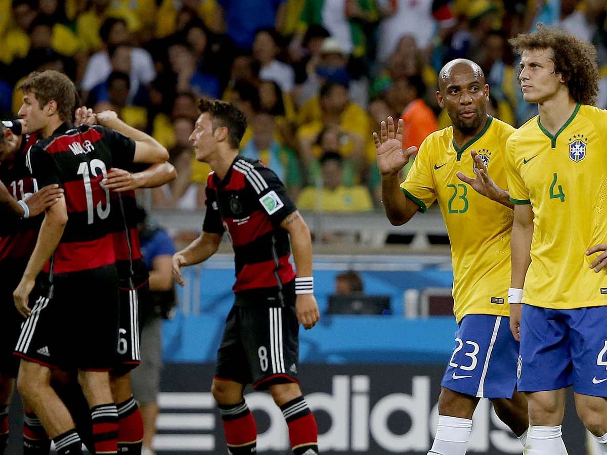 A goleada de 7 a 1 sofrida para a Alemanha fez com que os jogadores brasileiros exibissem diversas reações em campo durante o jogo; diante do placar até então impensável, eles se mostraram em alguns momentos assustados, cabisbaixos e até incrédulos com o resultado da partida. Na foto, Fred, Dante e Luiz Gustavo