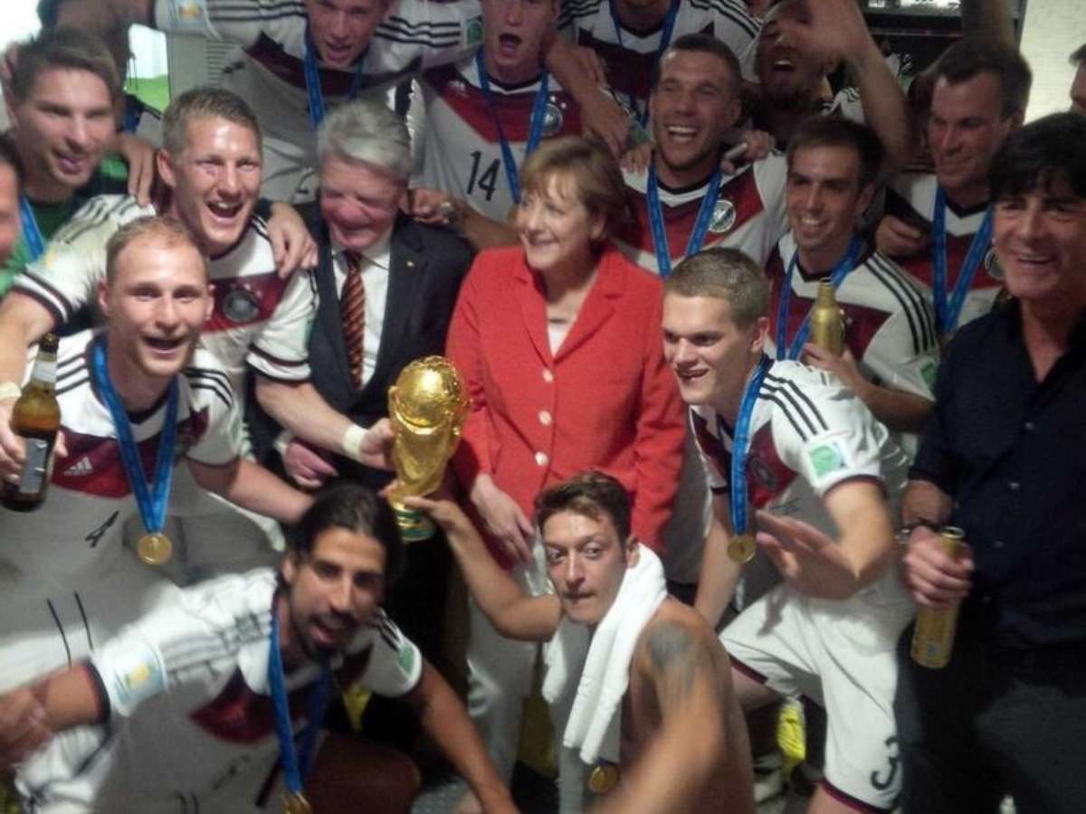 As fotos foram postadas no perfil oficial da Confederação Alemã de Futebol (DFB) no Twitter e no Instagram. “Somos campeões do mundo! Celebrando com a chanceler e o presidente”, era a legenda da imagem em que a taça é segurada por Schweinsteiger e Özil.