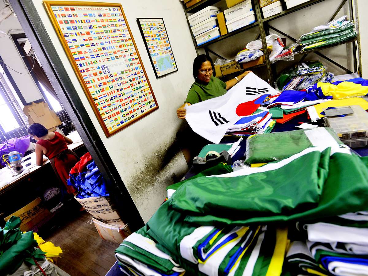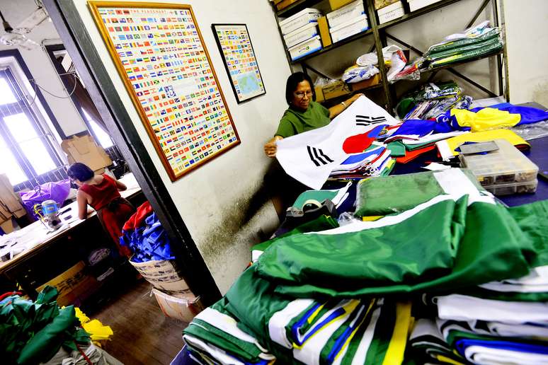 Na empresa, as cerca de 15 costureiras estão às voltas com a fabricação dos kits de 32 bandeiras (a partir de R$ 802), das seleções que disputam a Copa, que passaram a ser encomendados justamente para o torneio, principalmente por empresas e hotéis.