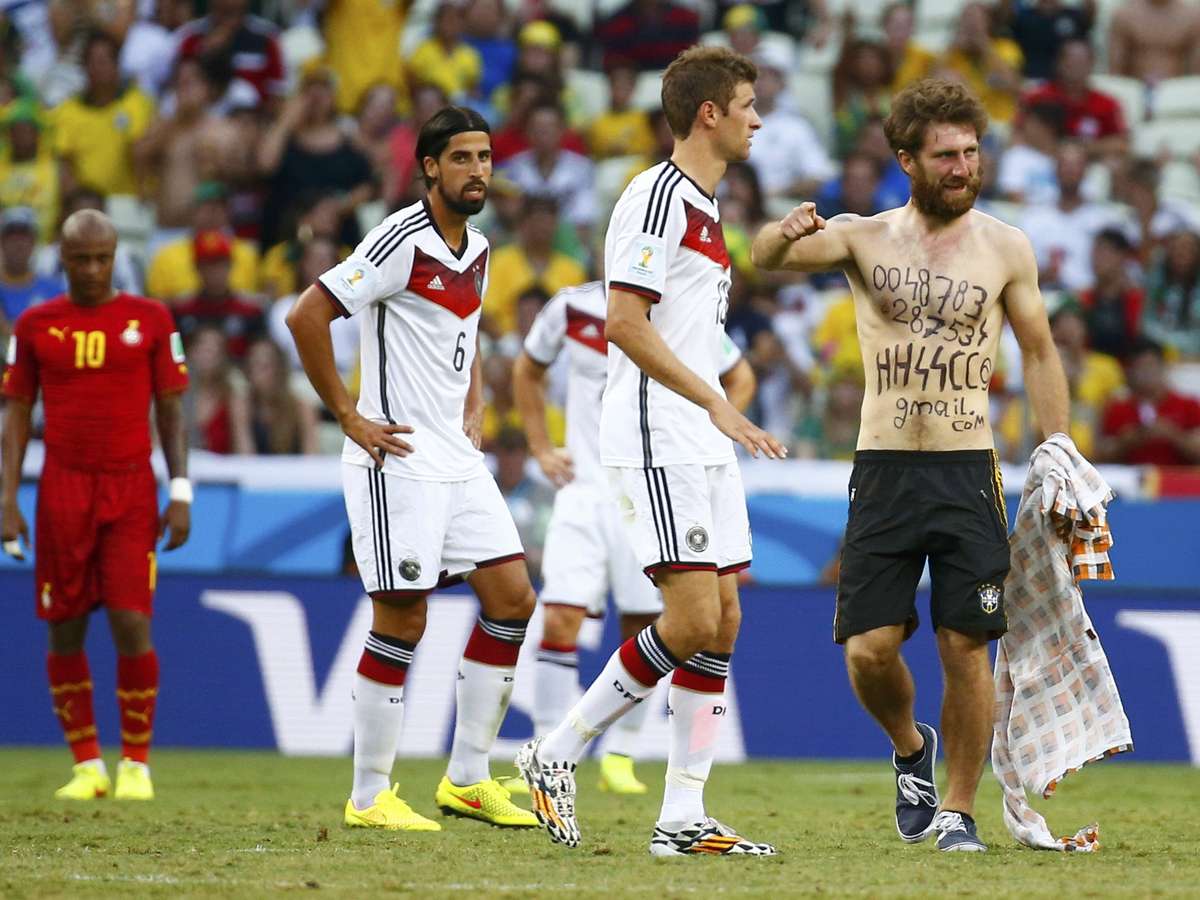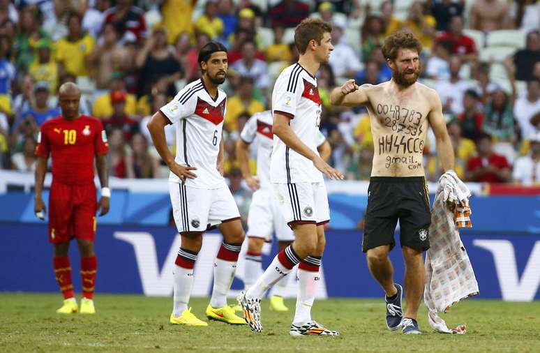 Torcedor burla a segurança da Fifa e invade o gramado da Arena Castelão, em Fortaleza, durante partida entre Gana e Alemanha válida pelo Grupo G