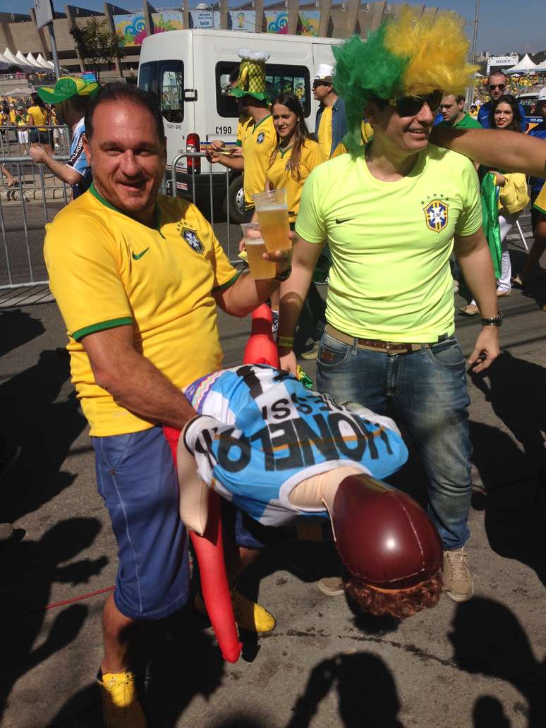 O carioca Luciano resolveu provocar os argentinos a caminho do Mineirão para Brasil x Chile neste sábado. O torcedor criou uma boneca inflável com a camisa da Argentina e passou a ser cobiçado por outros torcedores brasileiros. Segundo ele, uma forma de devolver o clima de brincadeiras que parte dos rivais. A boneca foi apelidada de Lionela e seria irmã de Lionel Messi.
