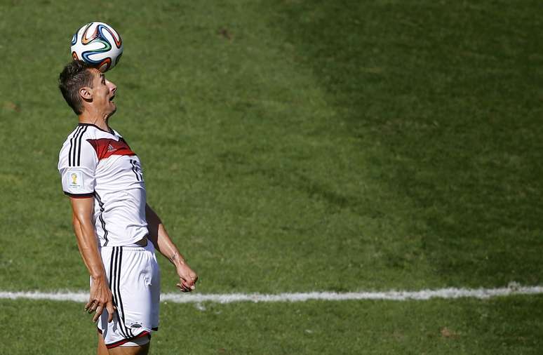 Titular no jogo entre Alemanha e França, Klose cabeceia a bola