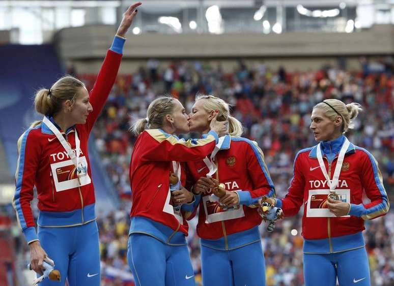 Não é raro que amigas russas se cumprimentem com beijos nos lábios, mas o fato ganhou repercussão em um Mundial de Atletismo marcado por polêmica acerca da nova lei local que proíbe a apologia da homossexualidade para menores -- parte de uma ofensiva conservadora do governo de Vladimir Putin.