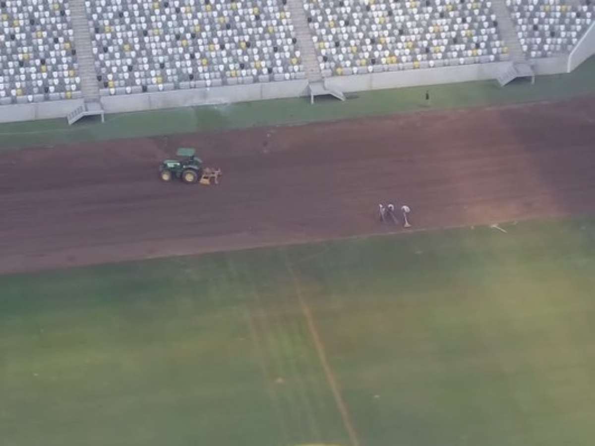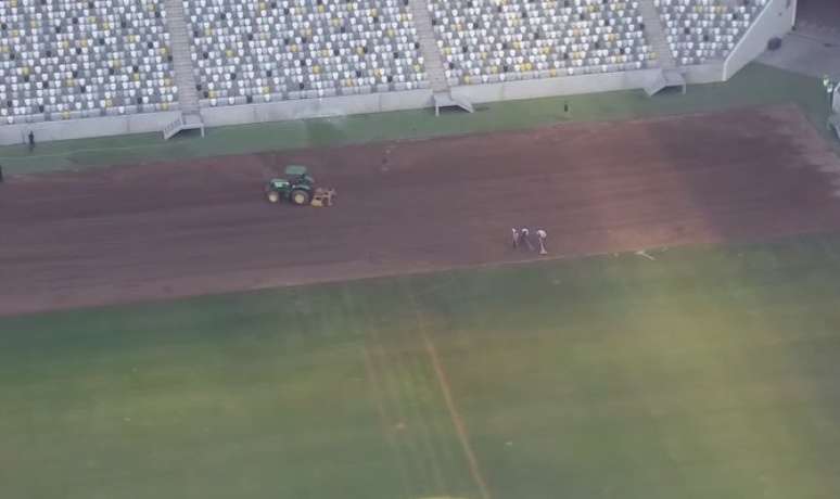 Imagens feitas pelo portal Itatiaia mostram que o trabalho principal no gramado está acontecendo no espaço entre a grande área e a linha de fundo. De olho na nivelação do campo, tratores trabalham no estádio para acelerar o processo de recuperação.
