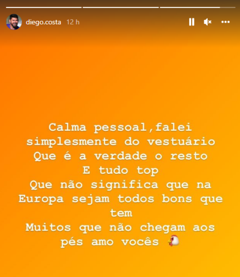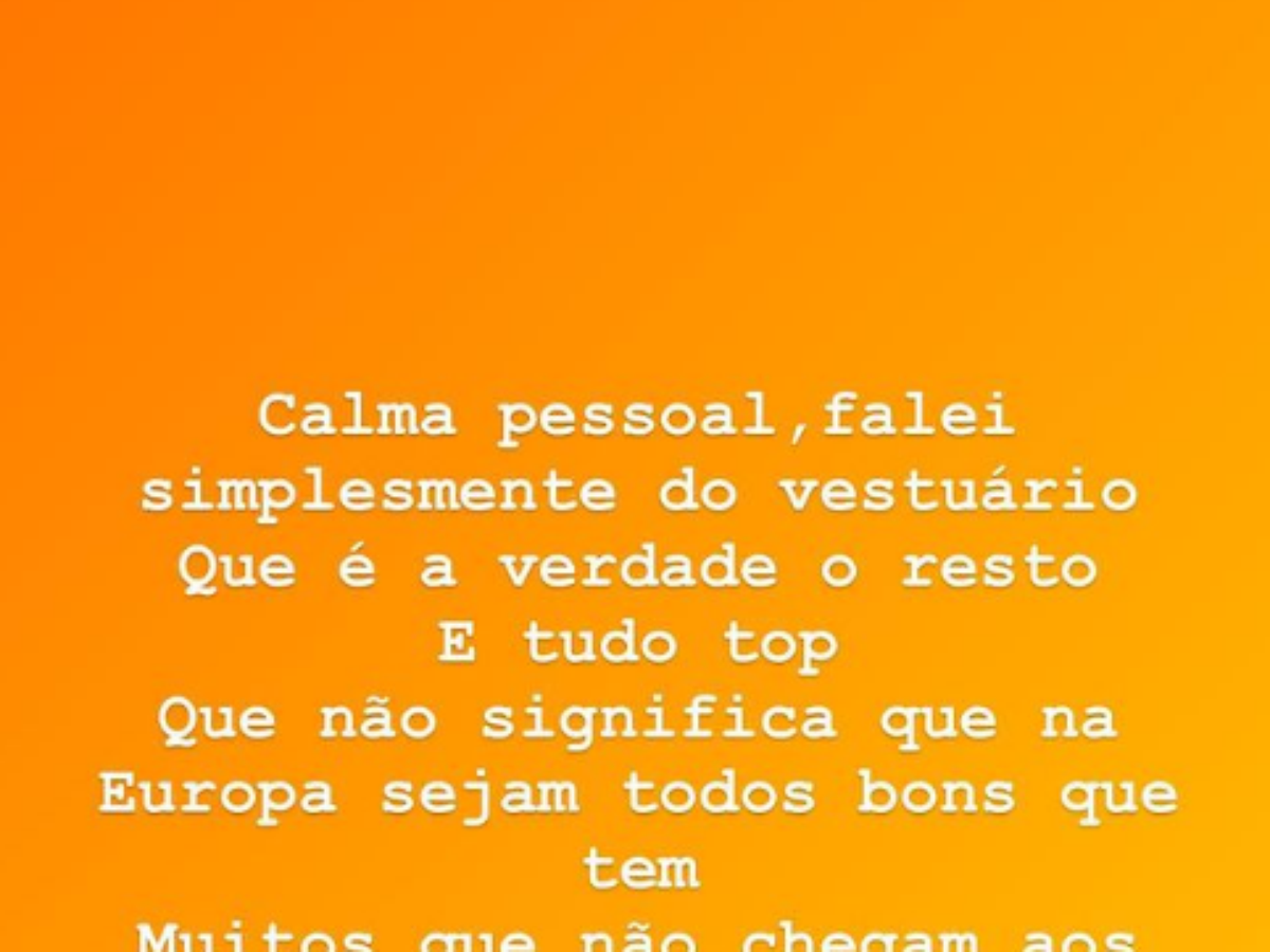 "Calma, pessoal. Eu falei simplesmente do vestiário, que é a verdade. O resto é tudo top. O que não significa que na Europa sejam todos bons. Tem muitos que não chegam aos pés. Amo vocês", escreveu nos stories de seu Instagram.