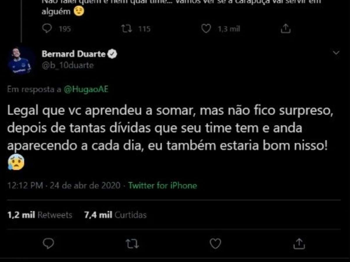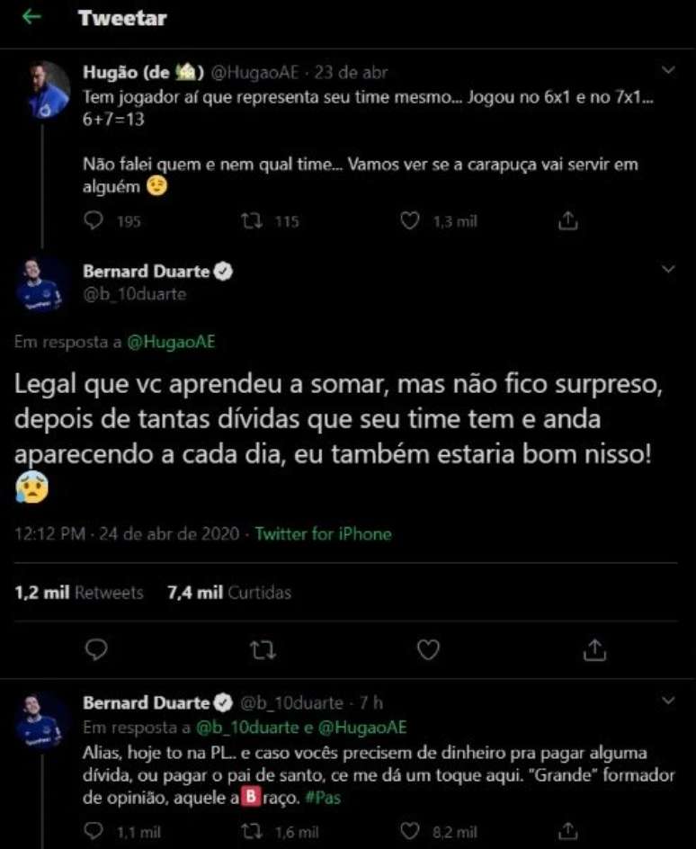"Legal que você aprendeu a somar, mas não fico surpreso, depois de tantas dívidas que seu time tem e anda aparecendo a cada dia, eu também estaria bom nisso", escreveu inicialmente Bernard, que foi além e provocou em relação a uma notícia de que o Cruzeiro teria uma dívida com um pai de santo referente a 2019, ano do rebaixamento para a Série B.