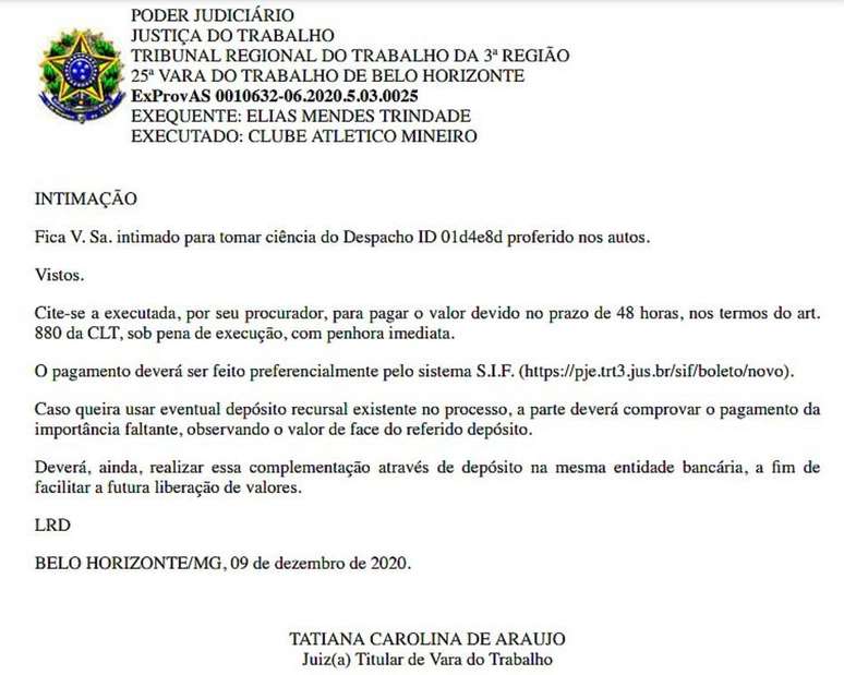 A Justiça do Trabalho de Belo Horizonte determinou que o Atlético-MG pague em até 48 horas o valor de quase R$ 2,7 milhões ao volante Elias, que deixou o clube e está atualmente no Bahia. O jogador passou pelo clube entre 2017 e 2019 e exige pagamentos referentes a salários atrasados, 13º, férias, saldo de FGTS e multas. O Atlético recorreu e aguarda a decisão.