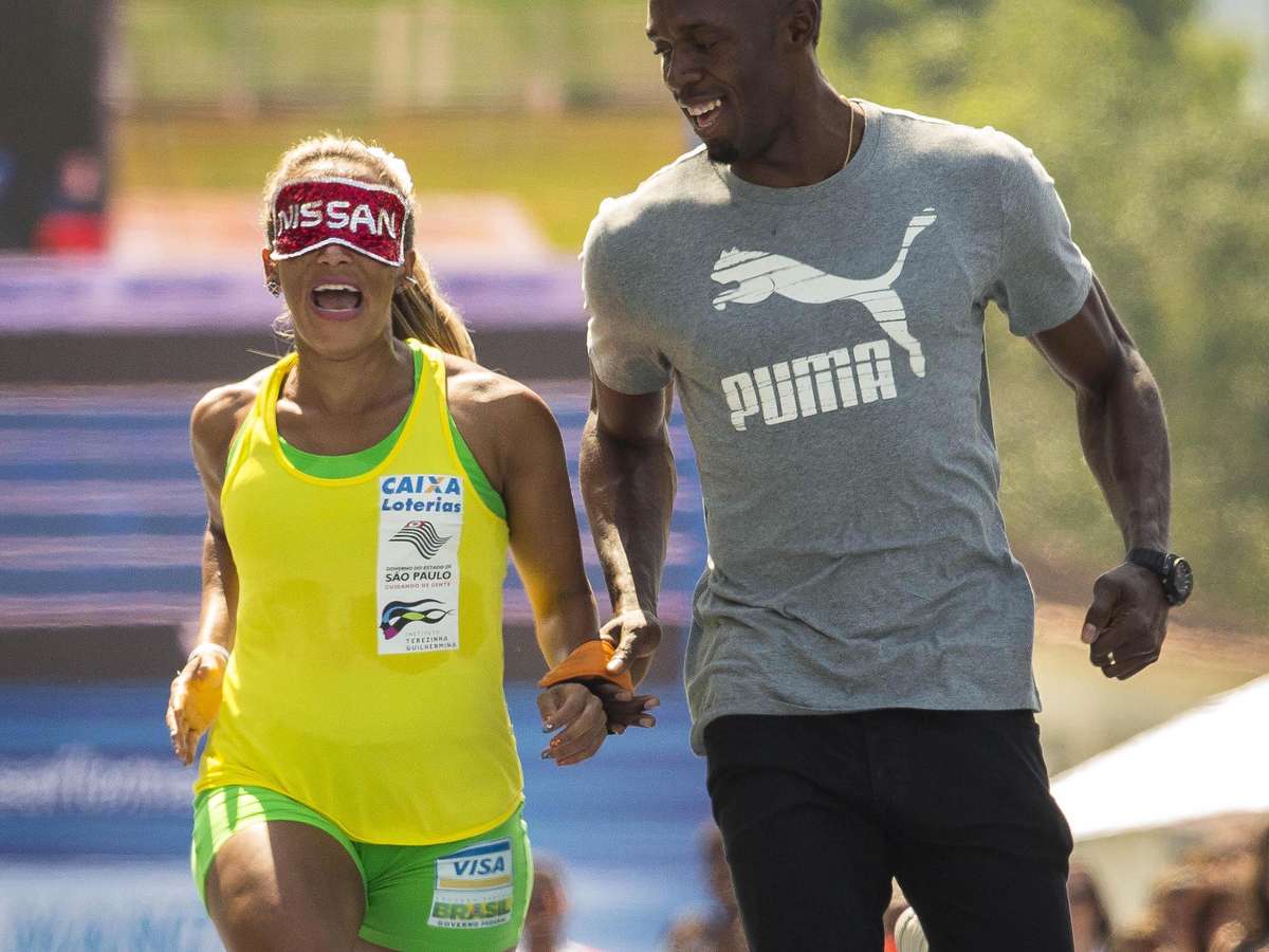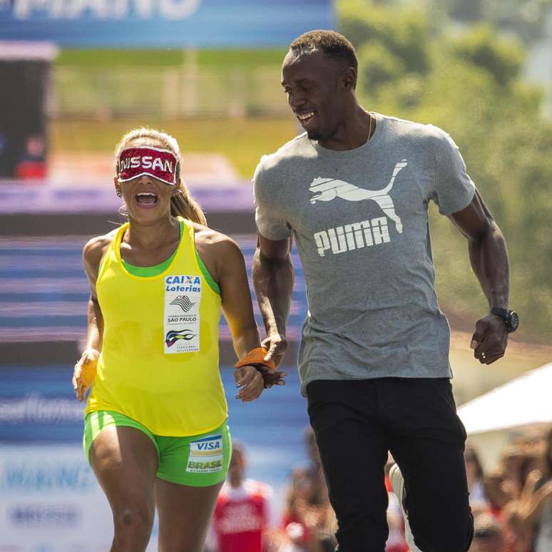 O jamaicano Usain Bolt formou com a brasileira Terezinha Guilhermina uma parceria entre o homem e a mulher deficiente visual mais rápidos do mundo, durante uma exibição no Jockey Club, neste sábado na Gávea, zona sul do Rio de Janeiro.