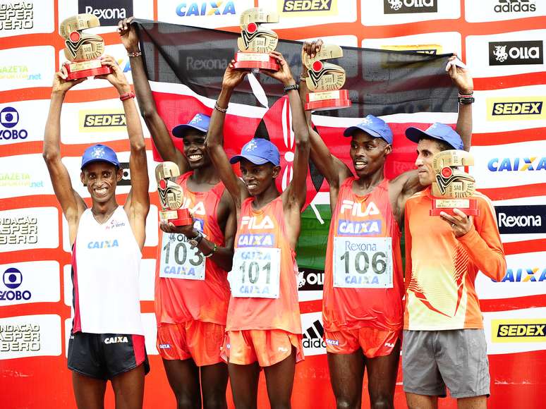 Quenianos exibem bandeira do país africano, que mais uma vez dominou a tradicional corrida pelas ruas paulistanas