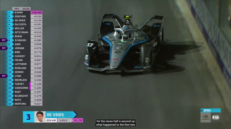Era o começo da série de voltas com potência máxima nos últimos 10 minutos de TL1. Tudo estava equilibrado até De Vries abrir nada menos do que 0s6 de vantagem sobre a concorrência. Lotterer até subiu para segundo, diminuindo um pouco a distância, mas não a ponto de mudar o destino da sessão.