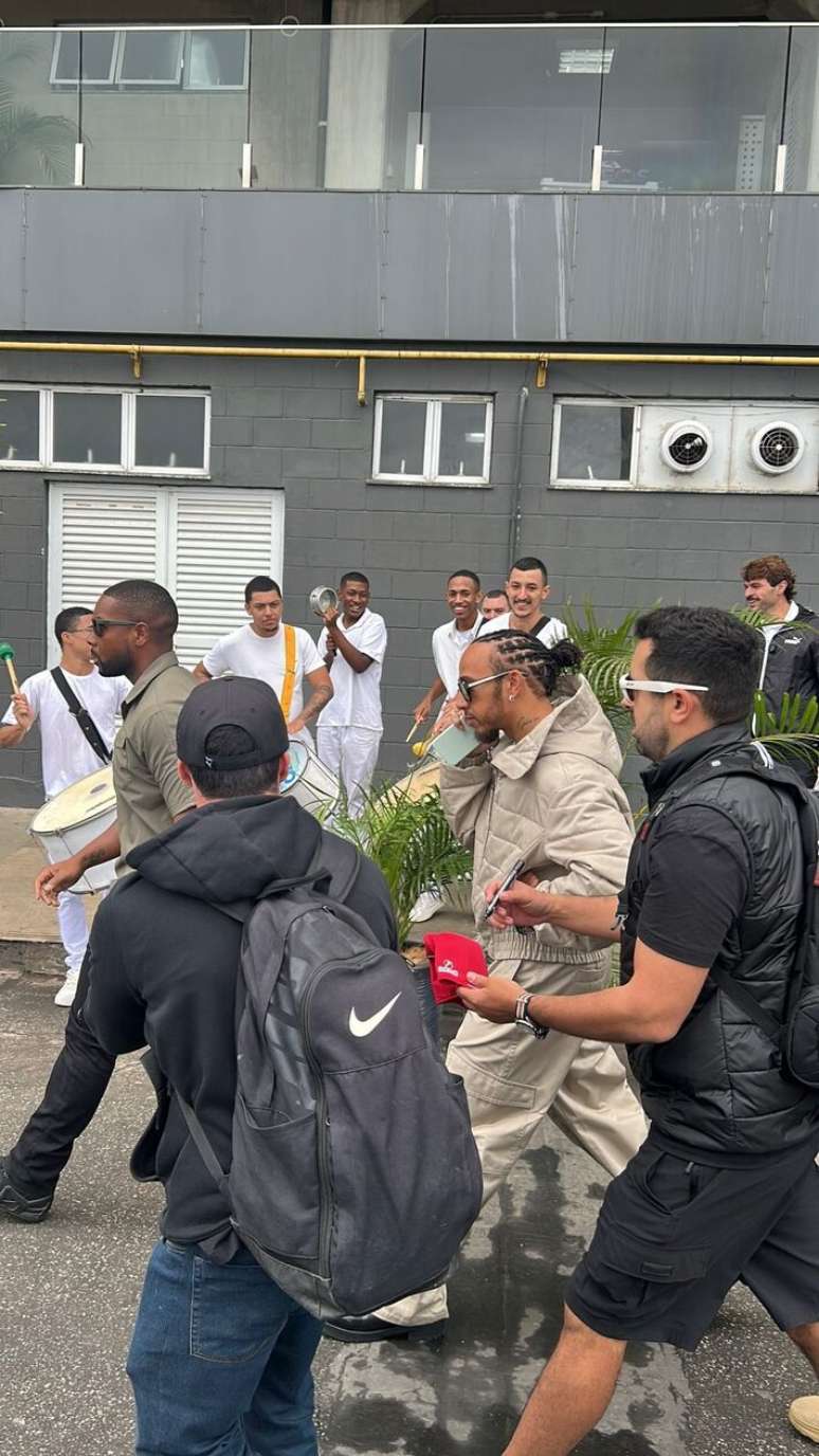 O batuque começou quando Hamilton desceu do carro, mas o piloto, vencedor em Interlagos nos anos de 2016, 2018 e 2021, não se animou. Ele passou reto sem apreciar a música a seu lado.