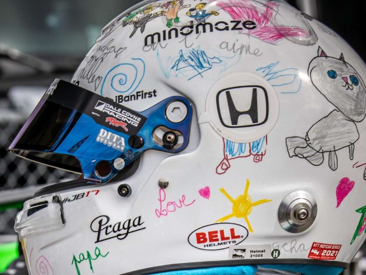 Na estreia pela Indy e no retorno após acidente gravíssimo no Bahrein, Romain Grosjean utilizou capacete desenhado pelos filhos Sacha, Simon e Camille. Francês foi 10º colocado no Alabama