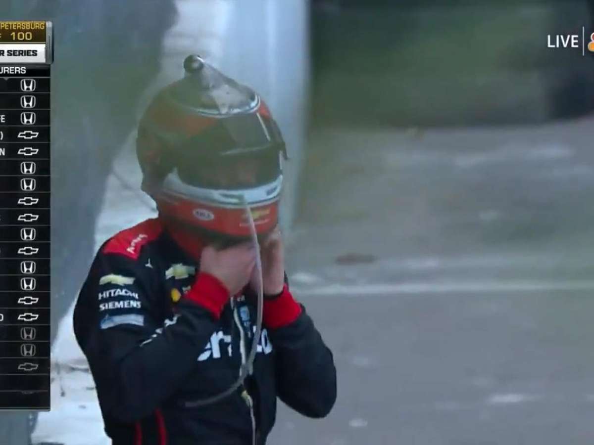Pole-position, Will Power foi o primeiro a abandonar o GP de St. Pete da Indy. O australiano da Penske perdeu a traseira do carro e bateu no muro na volta 36, causando a primeira bandeira amarela da decisão do campeonato. O piloto não escondeu a irritação pelo segundo abandono do ano, arremessando o dispositivo Hans, que protege cabeça e pescoço dentro do cockpit, no ar.