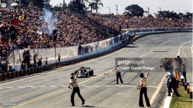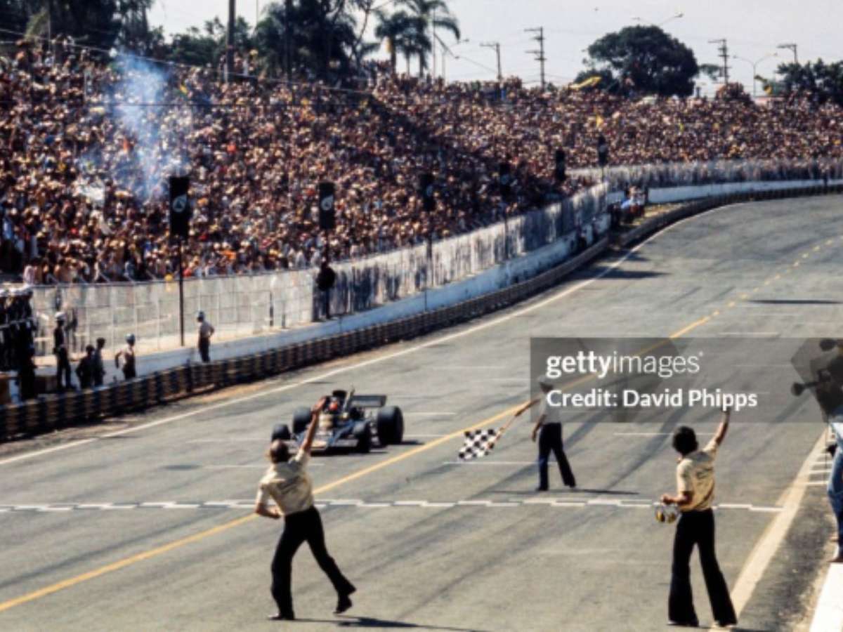 Emerson Fittipaldi cruza a linha de chegada no Autódromo de Interlagos e conquista a primeira vitória de um piloto brasileiro em solo nacional. A imagem de Colin Chapman e Peter Warr celebrando marca o início da paixão do Brasil pela Fórmula 1. (Crédito: David Phipps / Sutton Images)