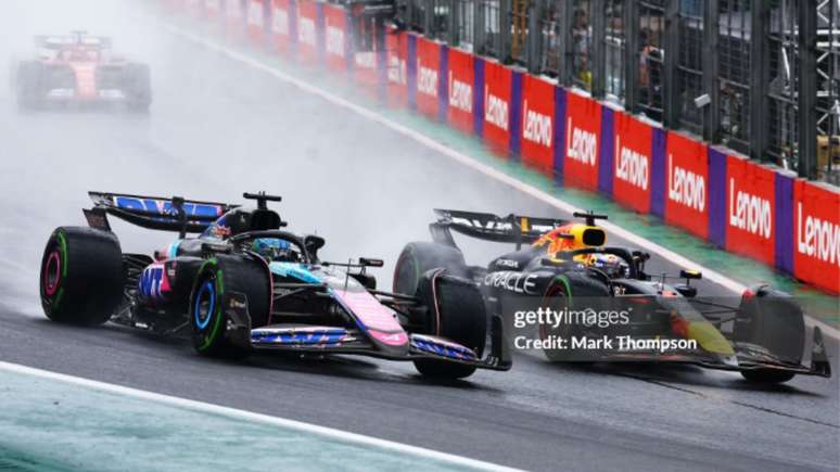 Max Verstappen ultrapassa Esteban Ocon sob chuva em Interlagos, reafirmando o domínio da Red Bull e a continuidade da tradição de grandes duelos no GP do Brasil. (Crédito: Mark Thompson / Getty Images)