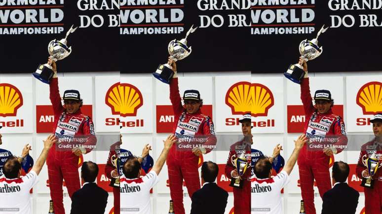 Ayrton Senna vence pela primeira vez o GP do Brasil, exausto e emocionado, com o apoio de Ron Dennis no pódio. Um dos momentos mais emblemáticos de sua carreira. (Crédito: LAT Images)