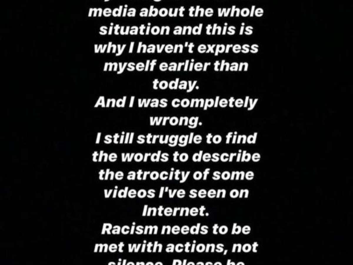 "Ver as notícias dos últimos dias me deixou triste, o que aconteceu com George Floyd e o que continua acontecendo na sociedade de hoje é uma vergonha. Agora, mais do que nunca, precisamos permanecer juntos, unificados. O racismo é tóxico e precisa ser tratado não com violência ou silêncio, mas com unidade e ação. Precisamos nos levantar, precisamos ser um nós. Vidas negras são importantes", desabafou.
