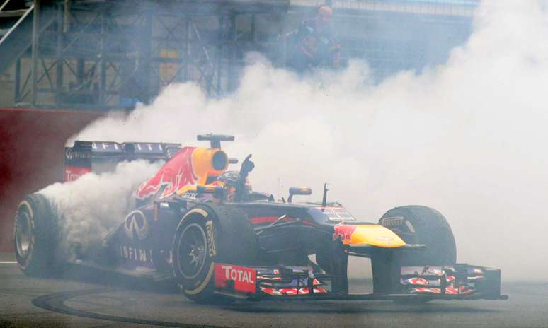 Vettel deu uma volta a mais no circuito de Nova Délhi após a vitória. Na reta principal do autódromo indiano, ele rodopiou o carro seguidas vezes, levantando fumaça para delírio da torcida. Ele deixou o cockpit e colocou os pés sobre o carro, socando o ar e pedindo aplausos.