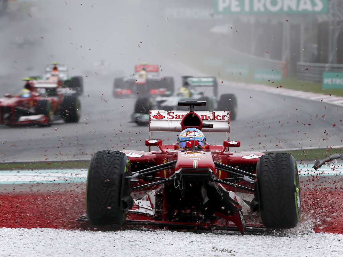 Em sua 200ª prova na carreira na Fórmula 1, Fernando Alonso não teve motivos para comemorar. O piloto largou na terceira posição no Grande Prêmio da Malásia, neste domingo, e rapidamente ultrapassou o brasileiro Felipe Massa para chegar ao segundo lugar. Ainda na primeira curva, porém, o espanhol tocou a traseira da Red Bull do alemão Sebastian Vettel, o líder, sendo obrigado a abandonar.