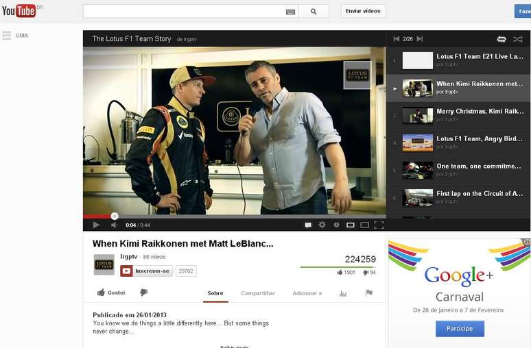 Primeira equipe da Fórmula 1 a apresentar o carro para a temporada 2013, a Lotus exibiu o E21 na última segunda-feira, em Enstone, na Inglaterra. Antes do lançamento, a escuderia veiculou em sua conta no site YouTube um vídeo no qual o piloto finlandês Kimi Raikkonen falava sobre suas expectativas para o novo monoposto – ou de sua falta de expectativas. O entrevistador era o ator americano Matt LeBlanc, famoso por interpretar o personagem “Joey Tribbiani” na série de televisão Friends.