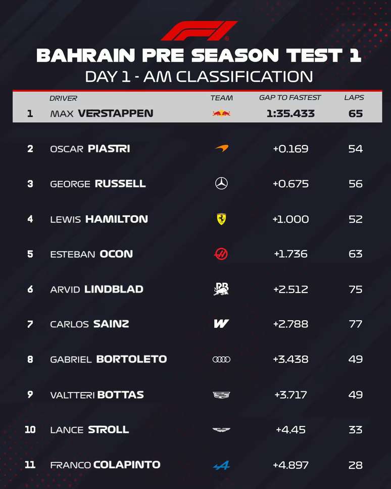 O holandês foi o mais rápido na sessão da manhã desta quarta-feira, marcando o ritmo no início do primeiro dos dois testes coletivos de três dias programados para o traçado barenita. Diferentemente do shakedown realizado em Barcelona, desta vez todas as 11 equipes participaram da atividade, incluindo a Williams, ausente na etapa anterior.