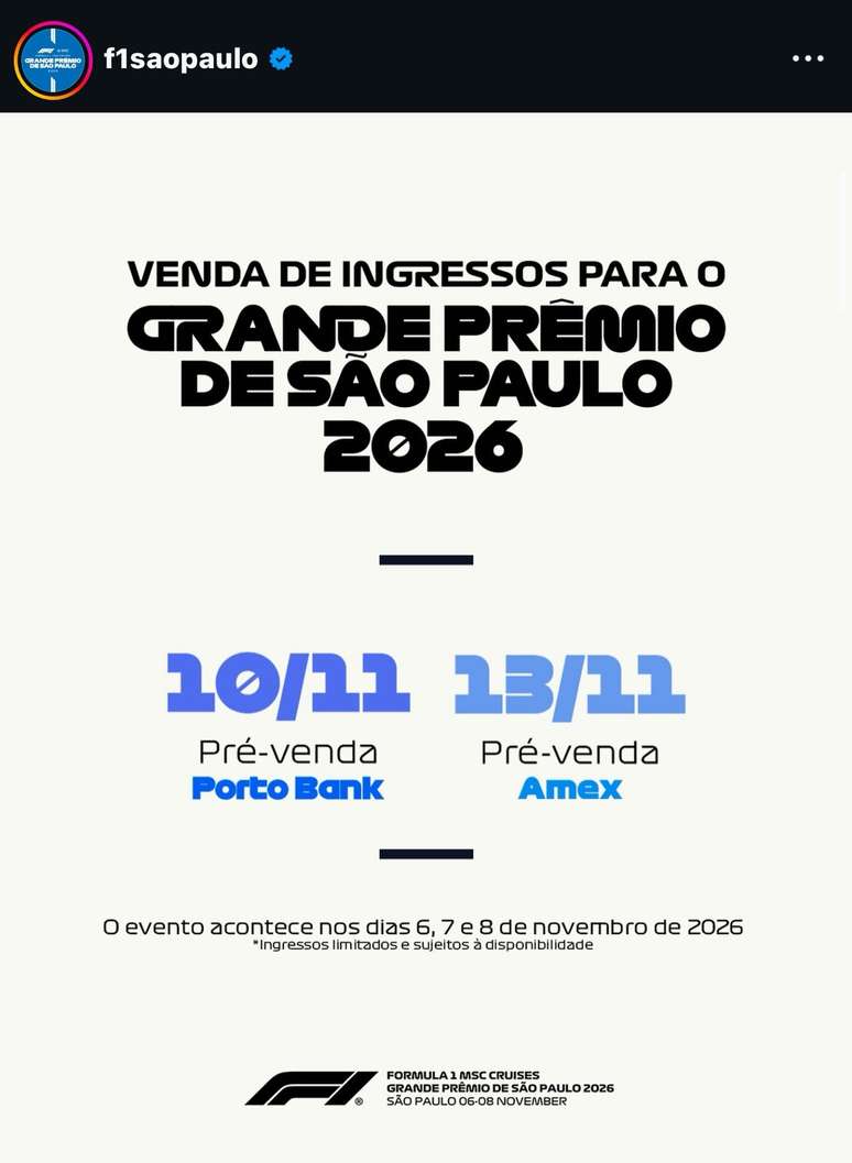 A organização do Grande Prêmio de São Paulo de Fórmula 1 anunciou nesta segunda-feira (3) as datas da pré-venda de ingressos para a edição de 2026, que acontecerá entre os dias 6 e 8 de novembro, no Autódromo de Interlagos.