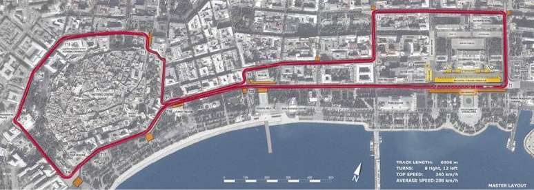 O traçado proposto por Hermann Tilke para Baku tem 6.006 metros e 20 curvas, oito delas para a direita e 12 para a esquerda. Espera-se que os pilotos atinjam até 340 km/h ao fim da reta principal, e tenham pouco mais de 200 km/h de média.