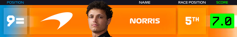 Sexta-feira arruinada por problemas técnicos que o colocaram na defensiva para a classificação. Ainda assim, tirou da cartola um respeitável 5º lugar no grid (superando Hamilton) e manteve a posição na corrida. Considerando o final de semana mais suave de Piastri, Norris fez o que pôde para limitar os danos.