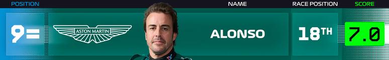 9=. Fernando Alonso (Aston Martin) - Nota: 7.0