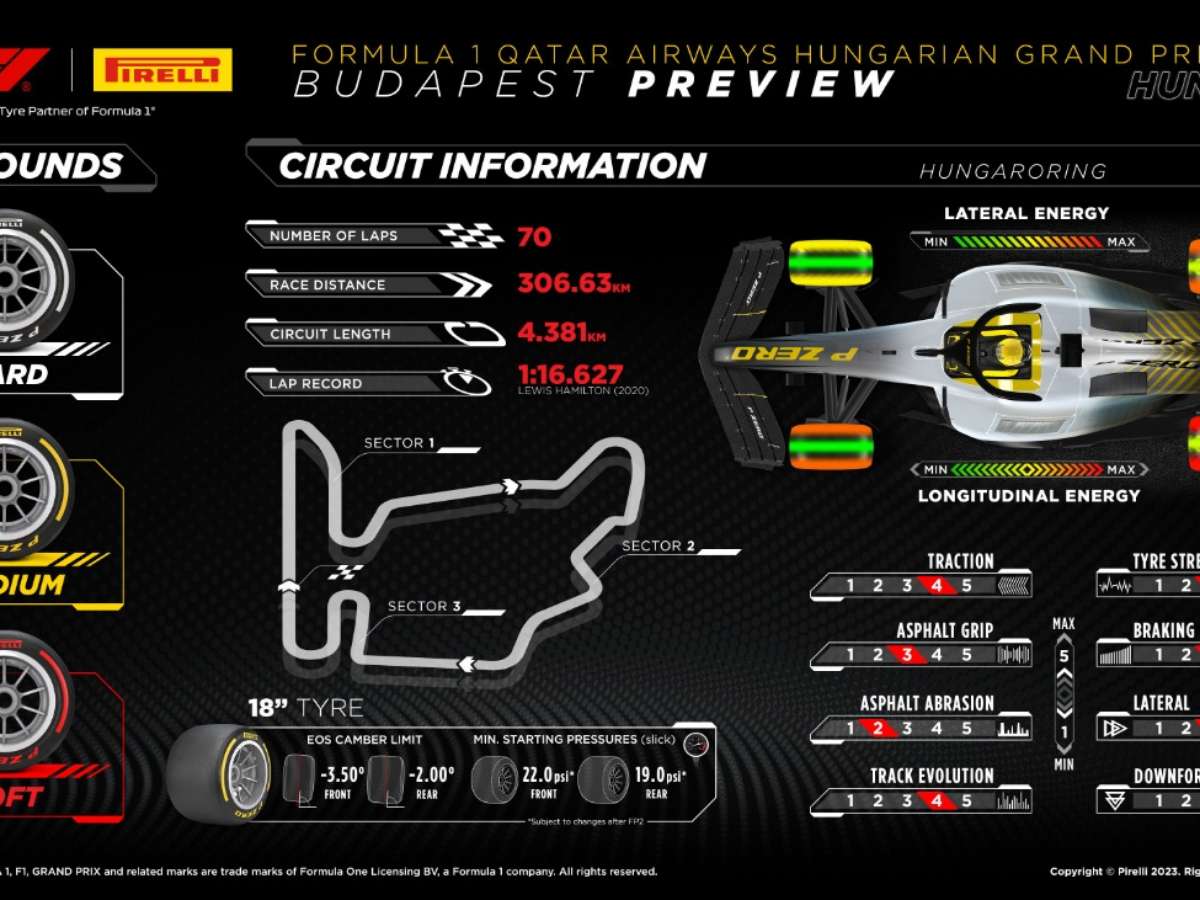Para o GP da Hungria, as equipes de F1 usarão compostos mais macios do que no ano passado. O C3 será usado como P Zero Branco duro, C4 como P Zero Amarelo médio e C5 como P Zero Vermelho macio.