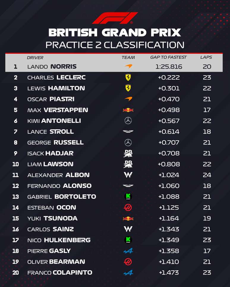 A segunda sessão de treinos livres do GP da Inglaterra, realizada nesta sexta-feira (04) em Silverstone, terminou com Lando Norris no topo da tabela. O britânico da McLaren marcou 1:25.816 e liderou o TL2 diante de sua torcida. A Ferrari fechou o top 3 com Charles Leclerc em segundo lugar, 0.222 atrás, seguido por Lewis Hamilton.