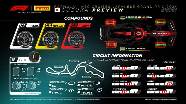 Suzuka é uma pista de concepção mais antiga, de raios longos e de asfalto relativamente abrasiva. Isso exige bastante dos pneus traseiros e faz com que a Pirelli mais uma vez seja conservadora na escolha dos compostos: novamente foi trazida a gama mais dura (C1/C2/C3).