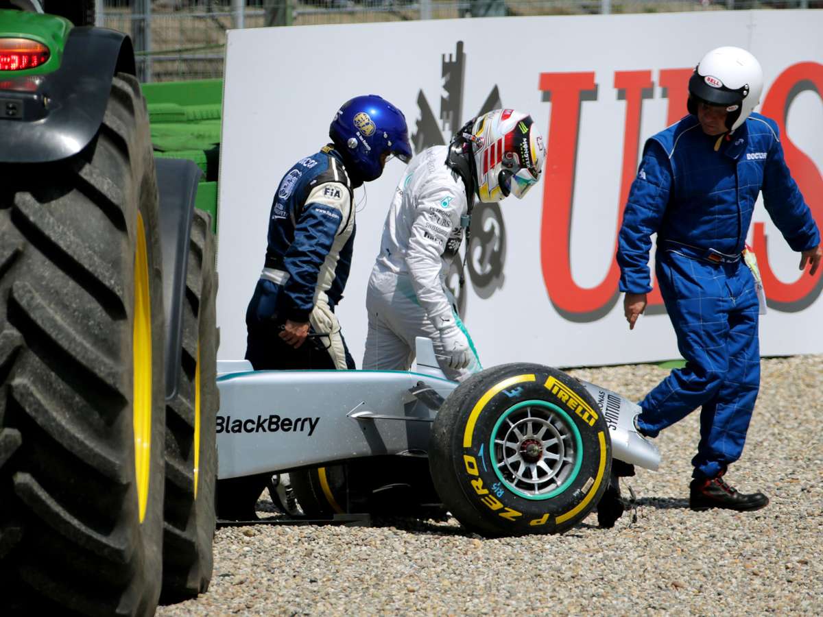 Hamilton era o segundo colocado do Q1 em Hockenheim quando seu carro sofreu quebra dos disco dianteiro direito. Com isso, ele escapou na curva 13, rodou e foi com força em direção à barreira de proteção de pneus. O acidente causou bandeira vermelha por aproximadamente dez minutos na atividade. O britânico saiu do carro caminhando normalmente e reclamou de problemas no freio.