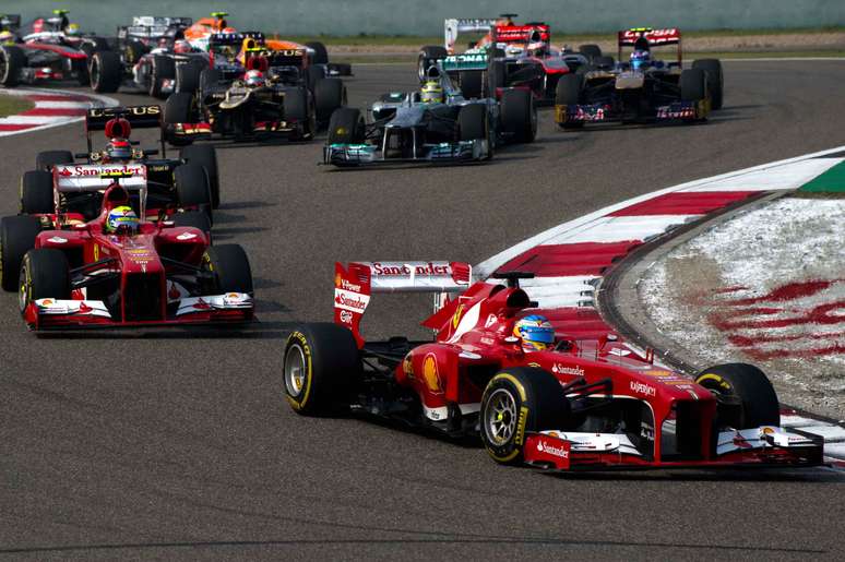 Foto mostra a embolada largada, durante a primeira curva do autódromo de Xangai