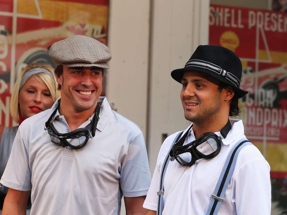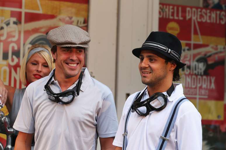 Os pilotos da Ferrari Felipe Massa e Fernando Alonso tiveram uma experiência inusitada nesta quinta-feira. Em um evento de um patrocinador antes do Grande Prêmio da Bélgica de Fórmula 1, em Spa-Francorchamps, os dois se vestiram com roupas típicas dos anos 1950 e simularam trabalhar em um posto de gasolina da época