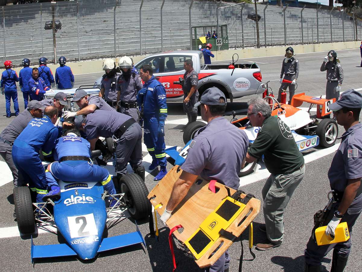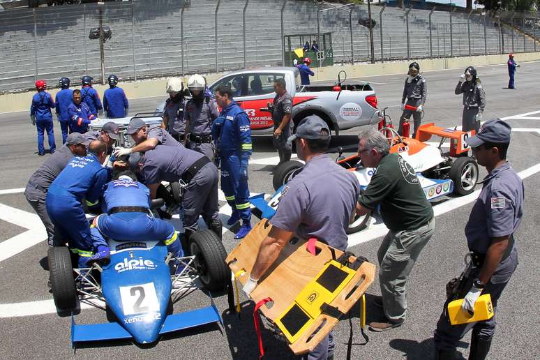 Médicos, bombeiros, equipes de resgate e sinalização e fiscais de pista do Grande Prêmio do Brasil de Fórmula 1 fizeram um simulado para o evento deste ano, no Autódromo de Interlagos, neste sábado. O ensaio geral contou com três largadas de carros da Fórmula Alpie, o trabalho de resgate depois da simulação de um acidente de pista, e o disparo de extintores de incêndio.