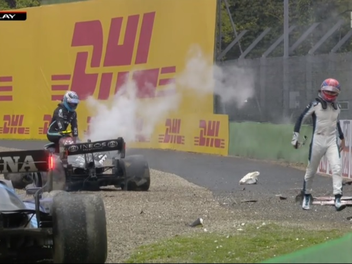 George Russell e Valtteri Bottas protagonizaram um fortíssimo acidente na volta 31 do GP da Emília-Romanha. Os dois pilotos se chocaram depois que o britânico da Williams tentou fazer a ultrapassagem e tocou a roda dianteira direita na grama molhada. A Williams #63 acertou o carro da Williams antes da chicane da Tamburello. A direção de prova acionou a bandeira vermelha