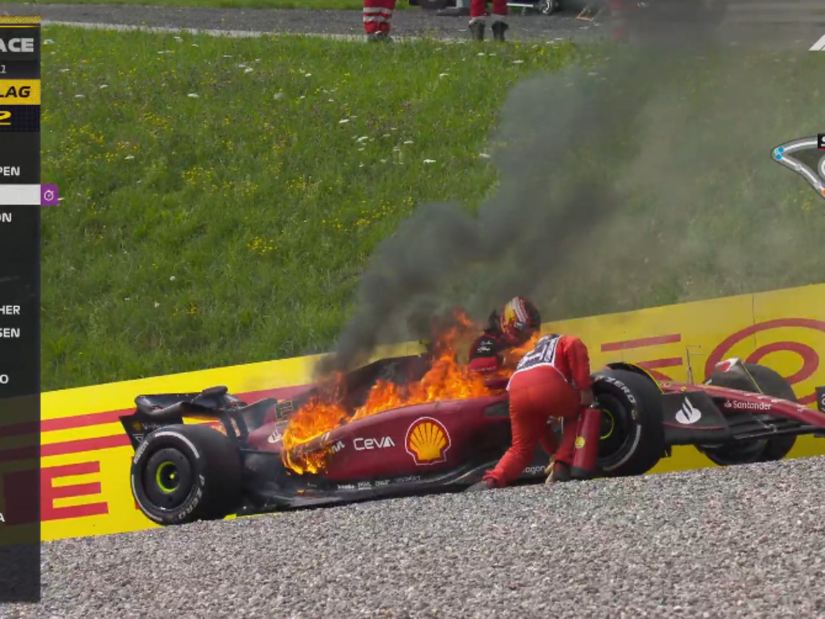 Carlos Sainz passou longe de ter o bom resultado da Inglaterra no GP da Áustria. Na tentativa de conseguir uma dobradinha para a Ferrari, o espanhol se aproximava de Max Verstappen, segundo . colocado, quando teve problemas com o motor de sua F1-75 na 58ª volta. Ele parou o carro na zona de escape e teve de sair logo, já que começou a pegar fogo.